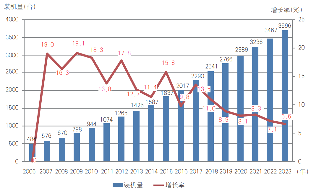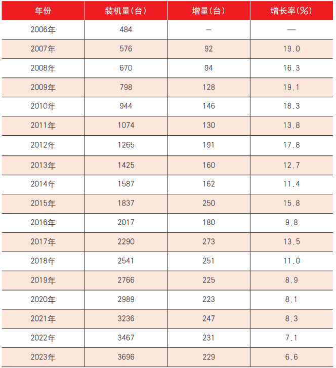 表1 2006~2023年中國(guó)內(nèi)地機(jī)組式柔性版印刷機(jī)裝機(jī)量及增長(zhǎng)率