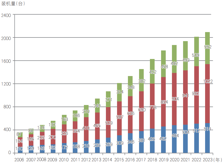 如圖2,將三大印刷產(chǎn)業(yè)帶進(jìn)行對(duì)比,2023年珠三角地區(qū)裝機(jī)量為519臺(tái),約占有明確地區(qū)分布裝機(jī)總量的17.0%,增量為7臺(tái);長(zhǎng)三角地區(qū)裝機(jī)量為1022臺(tái),占比為33.4%,增量為30臺(tái);環(huán)渤海地區(qū)裝機(jī)量為552臺(tái),占比為18.1%,增量為24臺(tái)。整體來看,三大印刷產(chǎn)業(yè)帶的裝機(jī)量累計(jì)為2093臺(tái),占有明確地區(qū)分布裝機(jī)總量的68.4%,裝機(jī)增量為61臺(tái)。