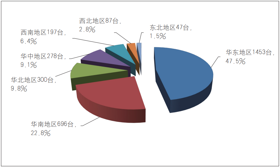 如圖3,從傳統(tǒng)地理分區(qū)來看,華東地區(qū)排在首位(增量為54臺(tái)),華南地區(qū)位居第二(增量為9臺(tái)),接下來依次是華北地區(qū)(增量為13臺(tái))、華中地區(qū)(增量為6臺(tái))、西南地區(qū)(增量為2臺(tái))、西北地區(qū)(增量為3臺(tái))、東北地區(qū)(增量為0臺(tái))。