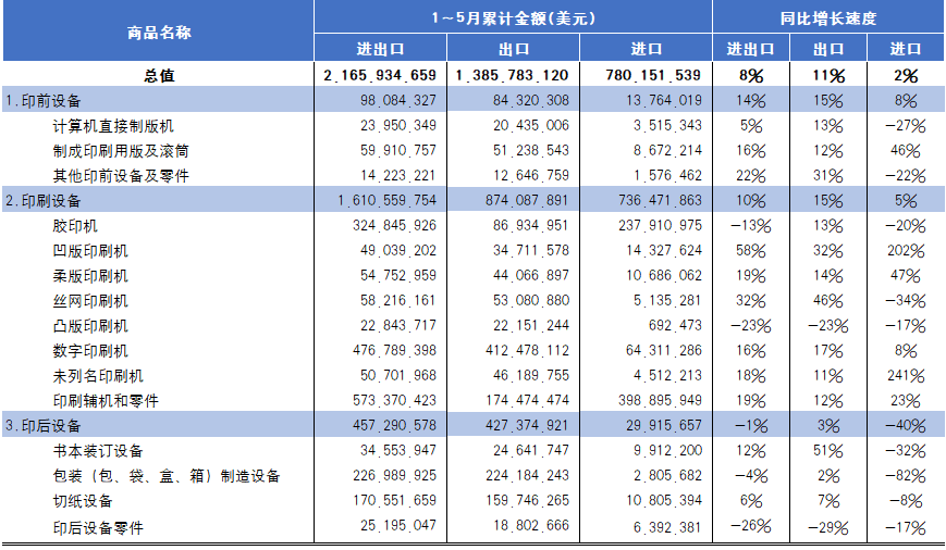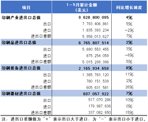 海關統計2024年1-5月國內印刷品、印刷裝備、印刷器材進出口動態