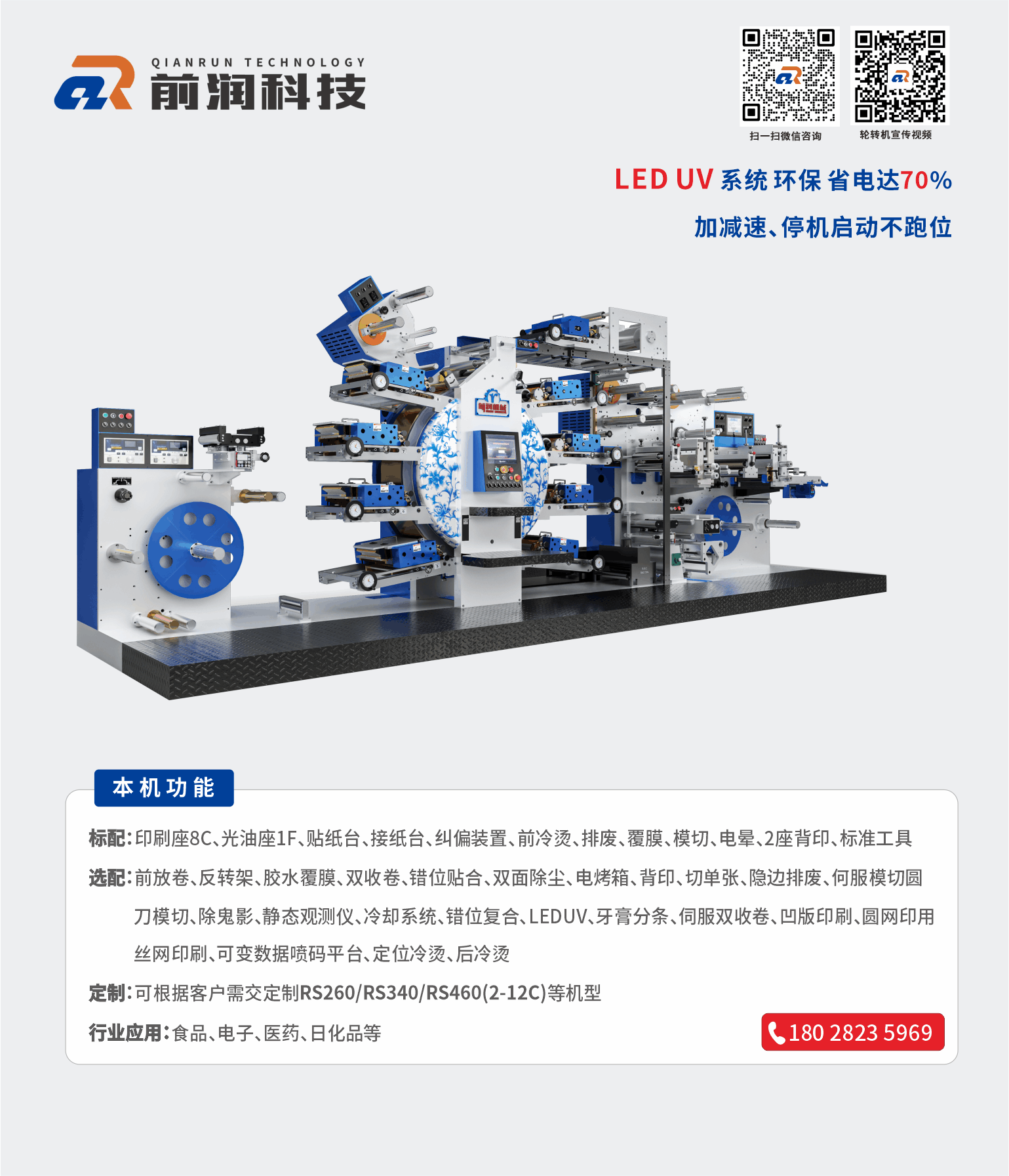 - 1、行業獨創伺服340模塊化工業設計,伺服多工藝組合式全輪轉印刷機,智能伺服間隙圓壓圓模切系統(免更換磁性輥)可以省去更換磁性輥筒的成本,提升換刀效率,可實現間隙式與全輪轉系統模切結合使用,集合定位冷燙,柔印, 凸印,凹印,絲印,膠印,圓刀模切等特殊配置可適應用于各行業實現多功能標簽印刷效果.