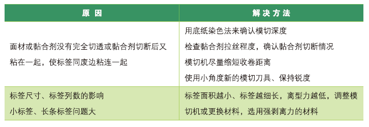 所謂模切掉標(biāo)(又稱飛標(biāo)),是指在模切過程中不干膠標(biāo)簽隨著排廢被帶起來的現(xiàn)象。在模切排廢過程中,不干膠材料離型力過低、模切處膠黏劑回黏、模切刀有破損或接口不齊等原因都會引起模切掉標(biāo)問題,嚴(yán)重的模切掉標(biāo)現(xiàn)象不僅會造成原材料浪費(fèi),還會給后工序帶來許多麻煩。那么,究竟該怎樣降低模切飛標(biāo)問題的產(chǎn)生呢?